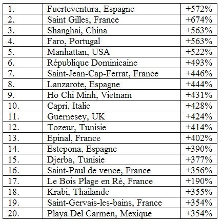 Epinal au contraire, fait une belle remontée en passant de la vingtième place à la treizième, avec + 402% de recherches d'Hôtels. Pour Saint Paul de Vence, la chute est rude : de la première place du classement au mois de juillet, la destination se retrouve en seizième position au mois d'août avec +356% de recherches.