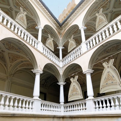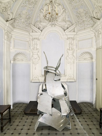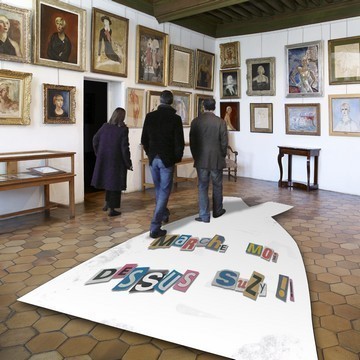 Inspiré par l'architecture, la décoration et l'histoire de ce fortin médiéval, l'artiste a créé une série d'oeuvres appelée 'Dress Code', spécialement pour le Château-Musée Grimaldi.