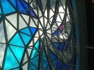 Entrée au 12 rue Linois après avoir coiffé le seyant casque de chantier obligatoire. Je découvre un espace lumineux où au centre des escalators desservent les quatre niveaux comme dans un gigantesque grand magasin. Je lève la tête pour admirer un plafond de mosaïques qui change de couleur suivant la course du soleil.