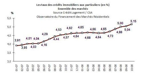 Les taux de crédit immobiliers se sont établis en moyenne à 5.15% en octobre, contre 5.08% le mois précédent. Depuis mai 2008, les taux ont déjà repris 50 points de base et ont atteint les niveaux de la fin 2001, indique l'Observatoire Crédit Logement/CSA