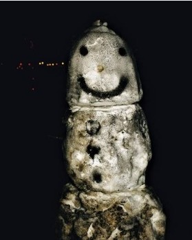 Or, le périple est chaotique, alternant intérieurs-extérieurs, ne nous donnant pas la possibilité de nous arreter dans la contemplation rassurante d'une ' belle ' image. La neige est sale et se transforme en eaux qui semblent engloutir les immeubles et leurs habitants. L'incontournable ' bonhomme de neige ', maronnasse plutôt que blanc, sourit de notre naive déconvenue devant une réalité qui éclate, crue, (cruelle ?) et néanmoins acceptable. Puisque telle elle est. Telle elle est devenue.