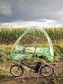 Et s'il était possible de continuer à pédaler malgré le froid et la pluie ? Pour nous y aider, un petit fûté (Arnaud Sarfati) a mis au point un système qui protége le cycliste et aussi, si besoin est, le siège bébé à l'arrière. Avec une forme et un tissu souple qui évoluent selon le vent sans jamais faire voile et sans gêner la conduite, Roofbi est entièrement montable en trois minutes et démontable sans outil.