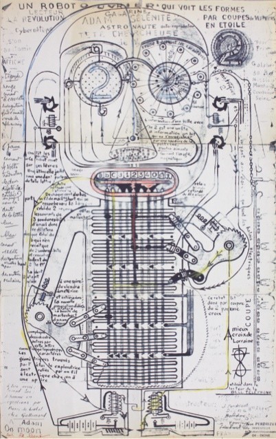 Sans titre (Un robot ouvrier qui voit les formes par coupes de vecteurs en étoile)Depuis les “robots adam sélénites”, comme ambassadeurs cosmiques de l'humanité, aux “machines pour communiquer avec les fantômes”, en passant par « les pipes volantes » ou “l'esperanto sidéral”, pour faciliter nos échanges avec les extraterrestres, Jean Perdrizet a conçu, dès l'âge de 24 ans, des inventions merveilleuses.