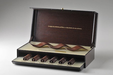 La prestigieuse pâtisserie chocolaterie de Rio de Janeiro a demandé à l'architecte plus que centenaire Oscar Niemeyer d'imaginer l'architecture des trésors d'une boîte de chocolats baptisée 'Q'. Résultat : un élégant coffret qui contient, au premier étage, des barres chocolatées à 77% de cacao brésilien en forme de vague et en-dessous, un plateau présentant sept crus différents destinés à la dégustation. Un livret et ' La magie de la fève parfaite et la découverte de son univers'