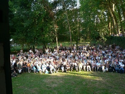 A gauche : Les arbres auxquels les livres doivent beaucoup...- Photo©Nicole Salez . A droite : Le comédien Michael Lonsdale - livre Confiance (Editions Onésime 2000) - qui a lu des textes sur Léonard de Vinci, lors du colloque 'Renaissance et nouvelle renaissance', organisé en plein air le 30 août - Photo©Nicole Salez.