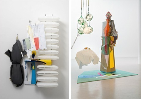 A g : '(MI&N 7577) JS #470', 2008 - 134,6 x 106,7 x 43,2 cm, à d : '(MI&N 8207) JS #490', 2009. Dimensions variables.Ainsi, table, vase, seau, fils nylon et électrique, tapis, tissus, verre, bois, plastique, et autres sont autant d'éléments très concrets que l'artiste agence et relie pour créer ses installations.