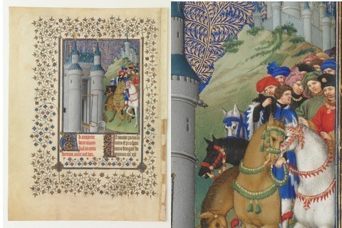 Les belles heures du Duc de BerryLa collection est somptueuse : le plus beau est peut-être celui des Belles heures du Duc de Berry (1400/1416), entré en 1954 dans la collection. C'est un travail des frères de LIMBOURG. C'est un ouvrage exceptionnel avec 94 miniatures en pleine page et un jeu de décoration magnifique. La peinture, a tempera et à la feuille d'or est d'une qualité remarquable, à l'égal de la peinture de chevalet. Voici un exemple : Saint Paul ermite regardant avec horreur un jeune homme chrétien qui se laisse tenter par une femme. On y voit un sens du volume et de l'espace qui montre que les artistes ont une bonne connaissance de la peinture italienne.