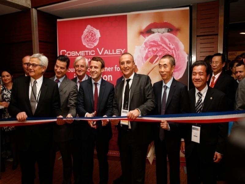 Légende photo : Le salon Cosmetic 360 inauguré par Emmanuel Macron et organisé par la Cosmetic Valley se positionne comme " la première vitrine internationale de l'innovation ". De gauche à droite : François Demachy et Thierry Wasser, les nez de Dior et de Guerlain, Emmanuel MACRON, Ministre de l’Economie, de l’Industrie et du Numérique, Marc-Antoine Jamet Président du pôle de compétitivité, , Hou Junchen, Président du China Summit, Mr Sakai, Maire de Karatsu (Japan Cosmetic Cluster) ; derrière le Ministre : Jean-Luc Ansel, directeur fondateur de la Cosmetic Valley. Photo Arnaud Lombard/Cosmetic Valley.