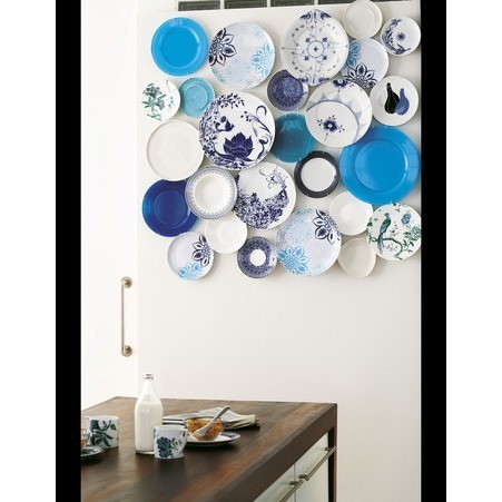 On oublie l'accrochage façon grand-mère et on joue l'installation façon arty avec une collection d'assiettes s'entrechoquant au maximum grâce aux supports montés sur ressort et de taille différente (BHV) et dans un autre genre....on dessine une cocotte avec des assiettes.