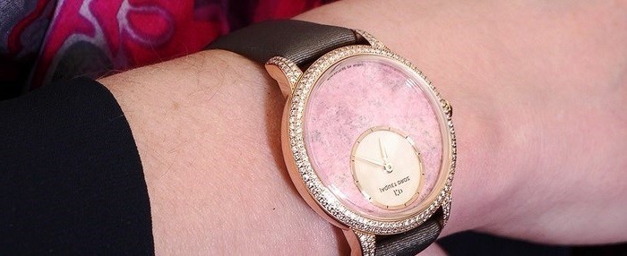 À l’occasion de la Saint-Valentin, Jaquet Droz ajoute un nouveau joyau à la collection Petite Heure Minute avec le modèle Astorite. Le cadran minéral, composé d’un disque d’astorite taillé et poli à la main, possède un compteur heures et minutes en nacre blanche décentré sur le haut. L’astorite, une gemme rare provenant d’une mine du Colorado qui appartenait à John Astor, dont elle tient son nom, voit la douceur de sa teinte rosée rehaussée d’infimes inclusions d’argent et d’or.